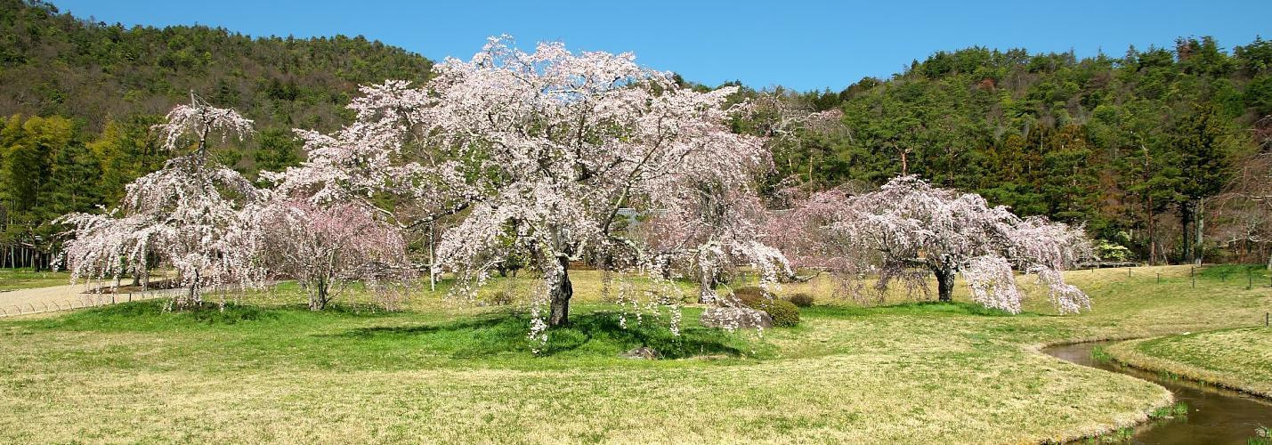 広庭にあるの三本垂れです。枝がやわらかく枝垂れる桜の総称です。エドヒガンの系統が多く、品種もさまざまです。ベニシダレなども有名です。開花時期は三月下旬~四月にかけてです。京都府の府花に指定され、円山公園のギオンシダレは特に有名で、今の桜は二代目で、三代目が二条駅東口前や平安郷の広庭で観られます。
